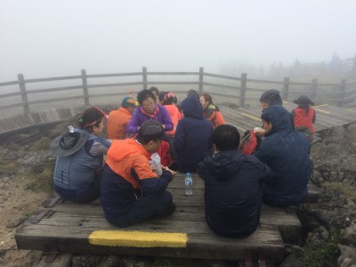 At the peak. Everyone enjoying meals.