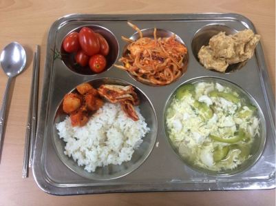 Cherry tomatoes, egg and zucchini soup, some style of korean coleslaw, kimchi, kimchi radish, and I have no idea the food in the top right corner 🙂