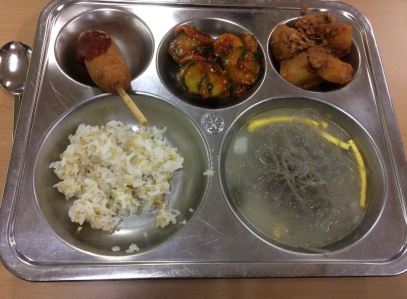 corn dog with ketchup, kimchi with vegetables zucchini, fish and potatoes, rice, soup with rice noodles and egg and beef